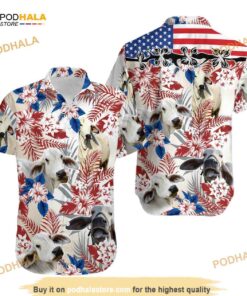 Tropical Floral Brahman Cow American Flag Hawaiian Shirt