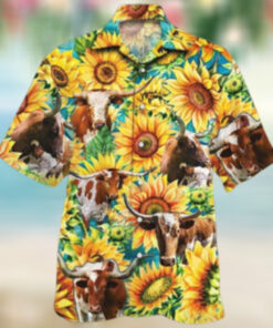 Tx Longhorn Cattle Lovers Sunflower Watercolor Hawaiian Shirt