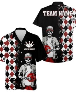 Bowling Custom Name And Team Name Hawaiian Shirt, Argyle Pattern Skull Bowling Personalized Hawaiian Shirts For Men Women, Bowling Lovers, Bowlers