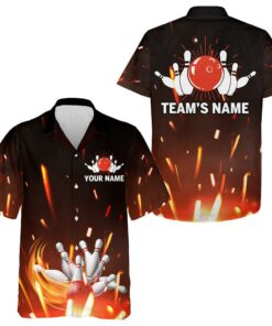 Bowling Custom Name And Team Name Hawaiian Shirt, Flame Bowling Ball And Pins Personalized Hawaiian Shirts For Men Women, Bowling Lovers, Bowlers