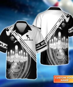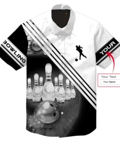 Bowling Hawaiian Shirt Custom Name – Black And White Bowling Ball In Motion And The Pins Personalized Aloha Hawaiian Shirt – Gift For Friend, Family, Bowling Lovers