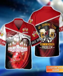 Bowling Hawaiian Shirt Custom Name – Drinking Team Red Bowling Ball Crashing Into Pins Personalized Aloha Hawaiian Shirt – Gift For Friend, Family, Bowling Lovers