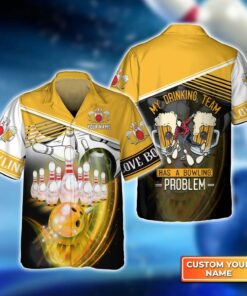 Bowling Hawaiian Shirt Custom Name – My Drinking Team Yellow Bowling Ball Crashing Into Pins Personalized Aloha Hawaiian Shirt – Gift For Friend, Family, Bowling Lovers